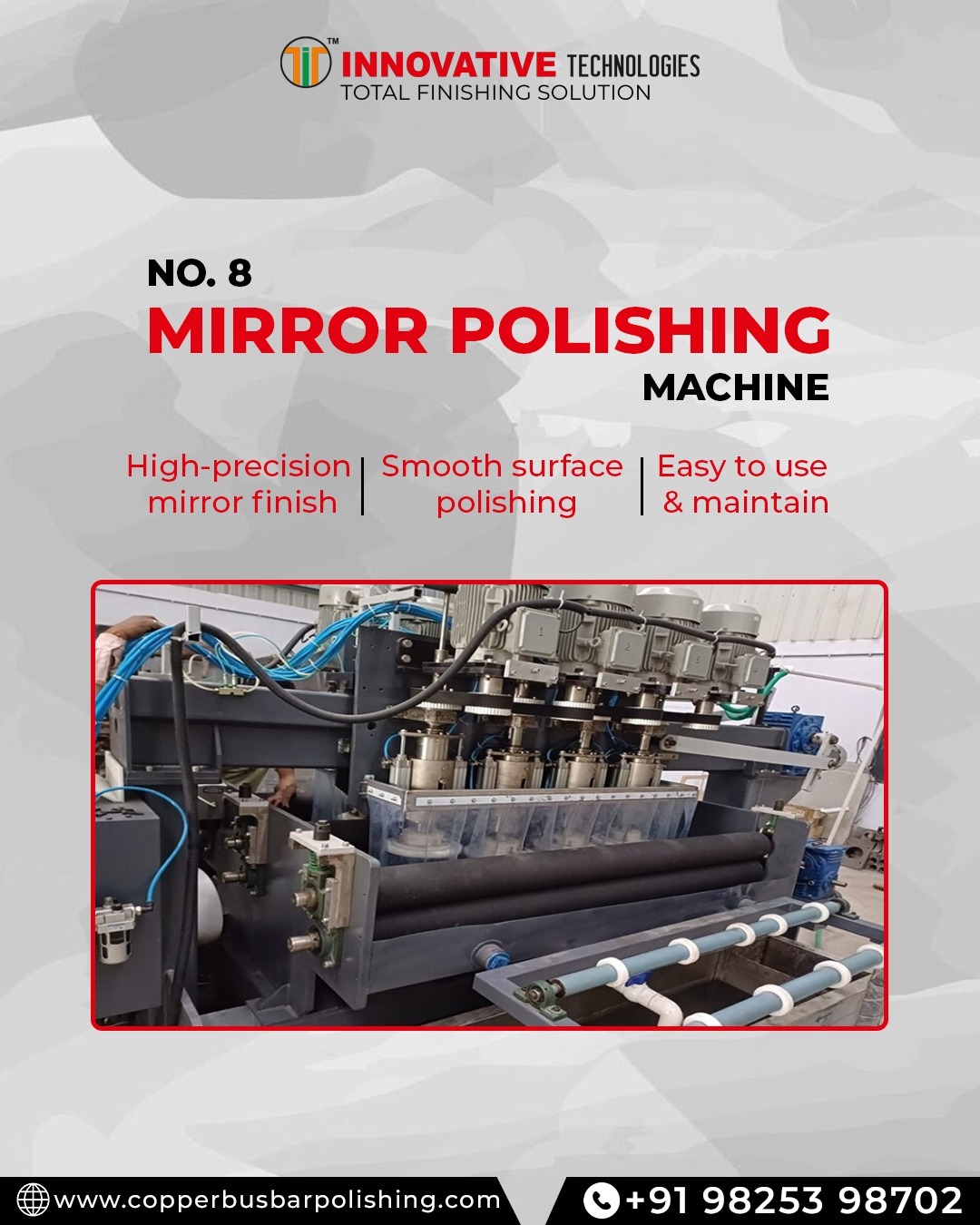 No. 8 Mirror Polishing Machine Manufacturers in India. The No. 8 Mirror Polishing Machine from Innovative Technologies delivers flawless, mirror-like finishes on metal surfaces, catering to industries that demand precision, quality, and speed. Ideal for automotive, architecture, home appliances, and food processing, it ensures consistent, high-gloss results. Key Features & Specifications • Working Thickness: 0.5–3 mm • Working Width: 1250 mm • Models: o Aditya 101: 16 heads, 1 sheet/hour o Aditya 102: 32 heads, 3 sheets/hour o Aditya 103: 48 heads, 8 sheets/hour • Customizable designs and polishing speeds • Note: Stainless steel sheets of 5mm should be flat for best results Applications Used across automotive, architecture, home appliances, and food processing, it polishes metal components, stainless steel panels, kitchen appliances, and production equipment to a high-gloss finish while meeting hygiene standards. Customer Benefits • Precision Finishing: Consistent mirror-like results • Production Efficiency: Scalable output from 1–8 sheets/hour • Customization: Adjustable features for sheet size, speed, and head configuration • Durability: Built with high-quality materials for long-term performance • Enhanced Visual Appeal: Creates attractive, polished surfaces Contact us for more details.